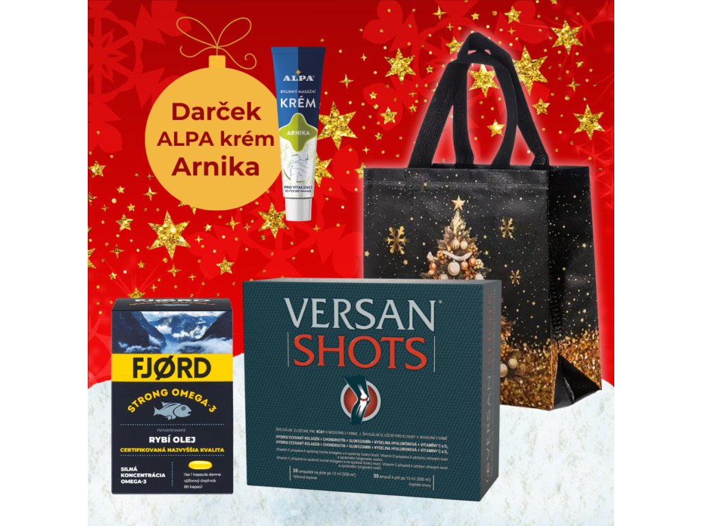 Balíček obsahuje: Versan Shots 30x10ml, Fjord Strong Omega-3 Rybí olej 80 kapsúl, Alpa Arnika krém 40 g + vianočná taška (motív vianočnej tašky sa môže líšiť)