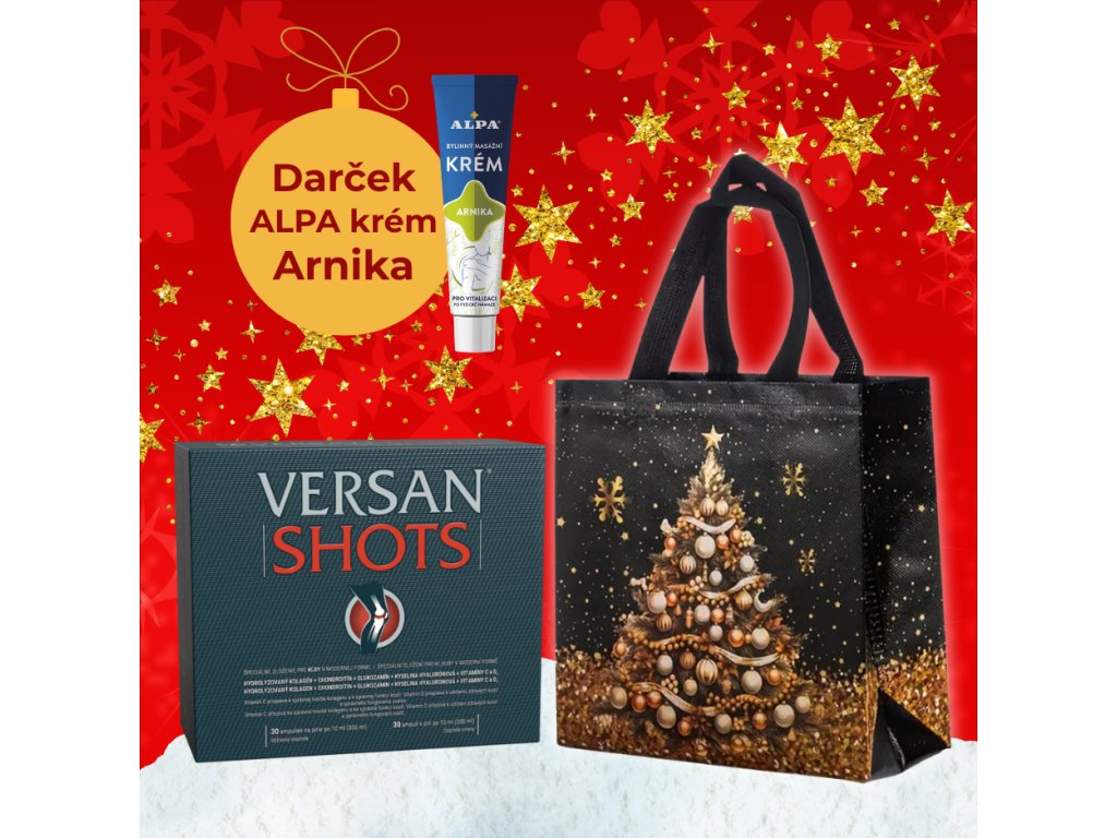 Balenie: Versan Shots 30x10 ml, Alpa Arnika krém 40 g + vianočná taška (motív vianočnej tašky sa môže líšiť)